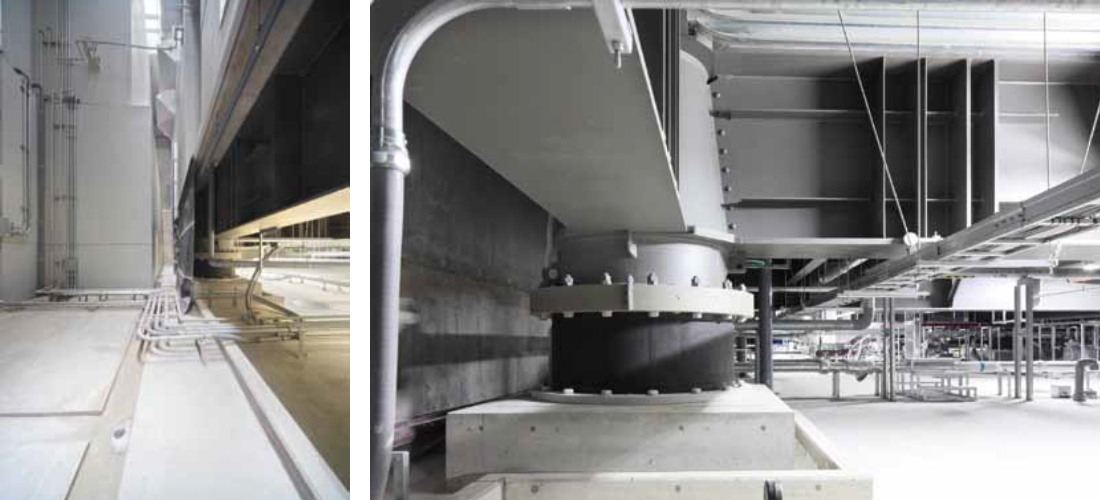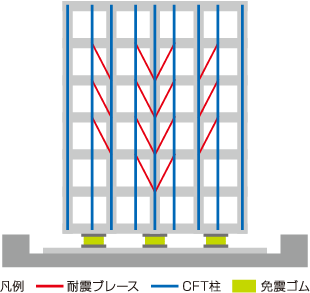 すべての居室を免震層にて支持する基礎免震構造を採用。また、コアフレーム内への耐震ブレースの配置により、「防災拠点、拠点病院等地震後に機能維持が必要とされる建物」に求められる耐震グレードを実現。更に、鉄骨断面の中に高強度コンクリートを充填した「CFT柱」の採用で地震時に必要な水平剛性を確保しています。