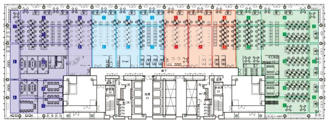 空調ゾーニングは1フロア4分割に設定。区画毎に運転・停止・冷暖房の設定・温度調節が行えます。さらにVAV(可変風量)方式により、1フロア32分割のきめ細かいエリアでの風量調節が可能です。