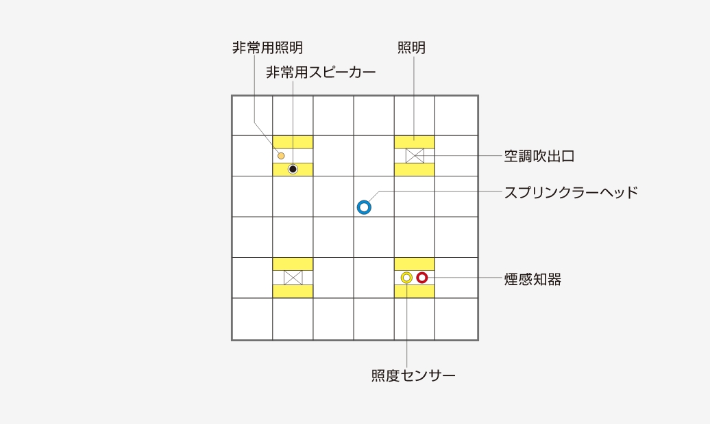 600mm×600mmのグリッド天井システムを採用し、3.6m×3.6mのモジュールの中に照明や空調吹き出し口などの設備ユニットと天上板をグリッド状に配置。レイアウトに応じてフレキシブルな対応が可能です。