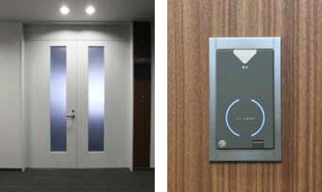 事務所扉には非接触型ICカードキーを標準装備。また、各階エレベーターホールにセキュリティー扉を設置することも可能です。(オプション)